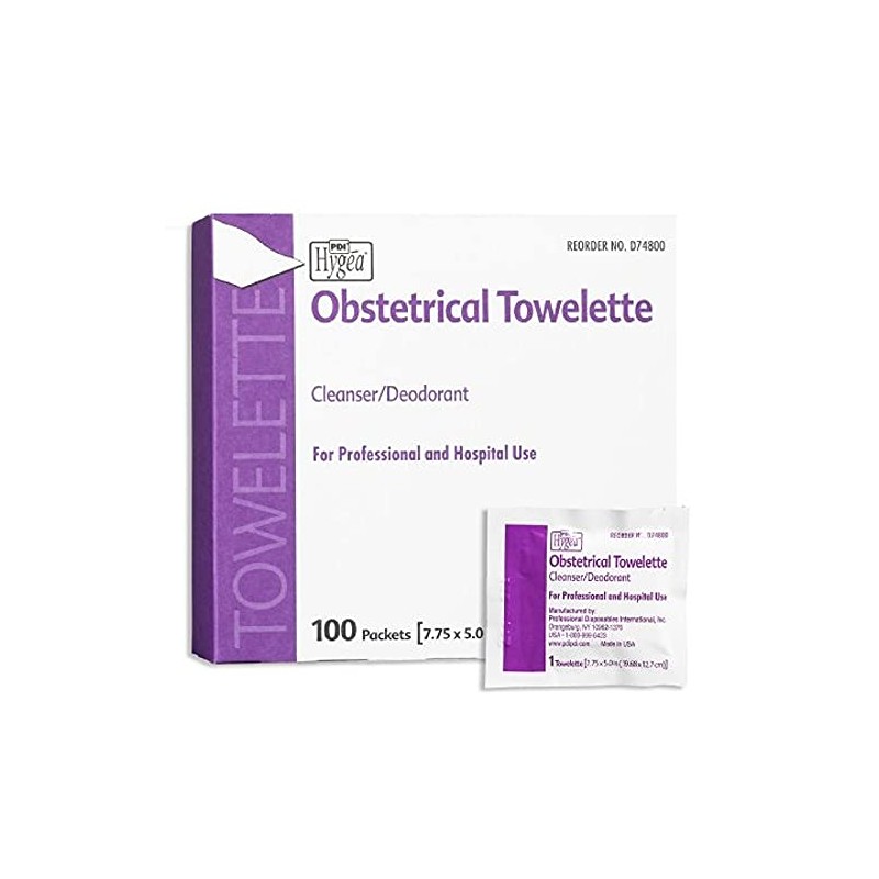 PDI Healthcare D74800 Hygea Obstetrical Towelette, 5" Width, 7.75" Length, Pack of 100. PDI Healthcare D74800 Hygea Obstetrical Towelette, 5" Width, 7.75" Length, Pack of 100. For personal hygiene at every napkin change and whenever cleansing/refreshing is needed.. 5" width. 7.75" length. Pack of 100.. . .. 5" width. 7.75" length. Pack of 100.. . .