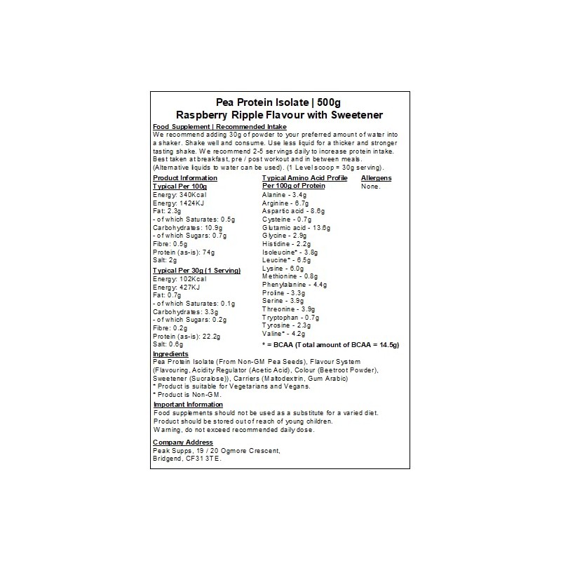 Pea Protein Isolate Powder Unflavoured - Vegan - Non-GM (500g, Raspberry Ripple)