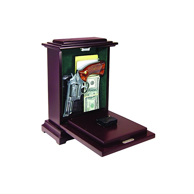 For Concealment and Convenient Storage of your Handguns and Other Valuables - Solid Wood with Rich Mahogany Stain - Reliable quartz movement with magnetically latched, hinged front panel - Holds a large handgun and other valuables