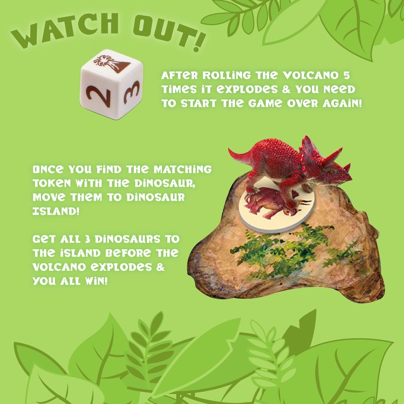 - HOW TO PLAY: Work together to move the dinosaurs around the board. Uncover matching dinosaurs under fern tokens to rescue dinosaurs. Get the dinos to safety before the volcano erupts and everyone wins.
