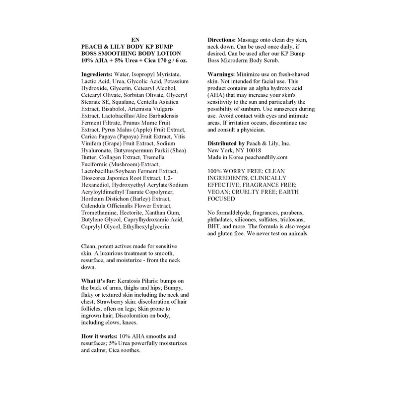 Introducing the Peach & Lily KP Bump Boss Smoothing Lotion - Your Ultimate Solution for Velvety, Radiant Skin! Are you tired of dealing with pesky body bumps, rough patches, and dry skin from the neck down? Look no further! Our luxurious KP Bump Boss Smoothing Lotion is here to transform your skin, making it smoother, softer, and more radiant than ever before. Don't miss out on the chance to transform your skin and elevate your confidence. The Peach & Lily KP Bump Boss Smoothing Lotion is your go-to solution for luxurious, head-to-toe skincare. Unleash your skin's natural radiance and embrace the smooth, soft, and hydrated results you've been longing for. Upgrade your skincare routine today with Peach & Lily, and let your skin become the boss!