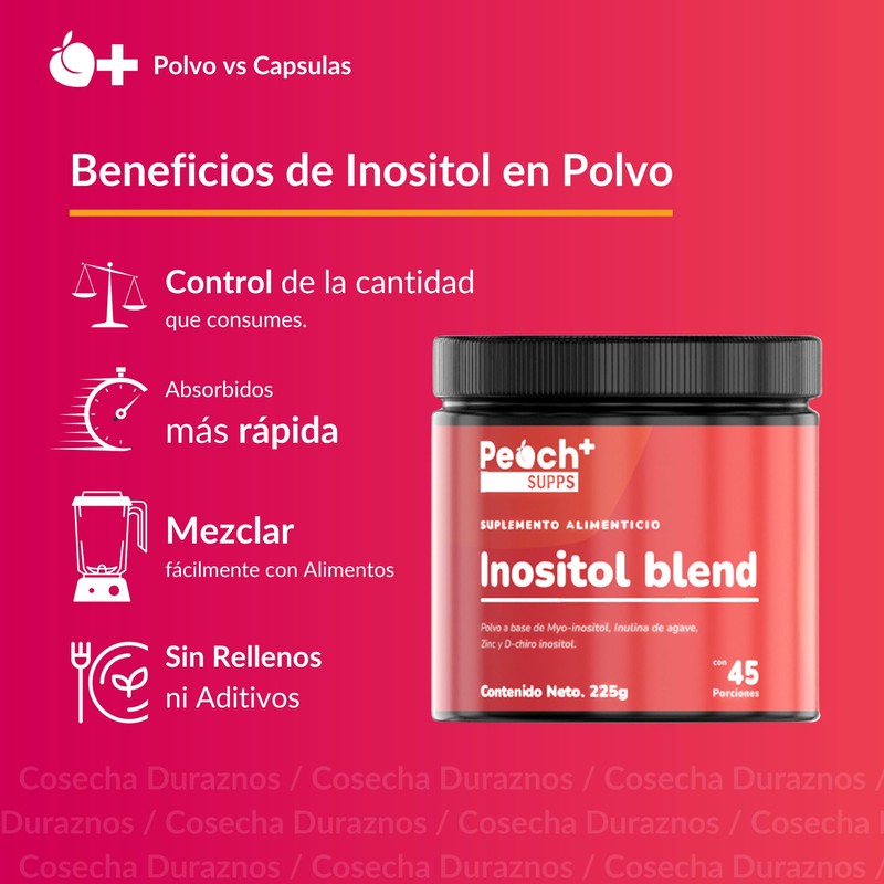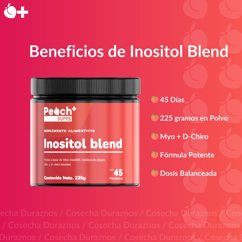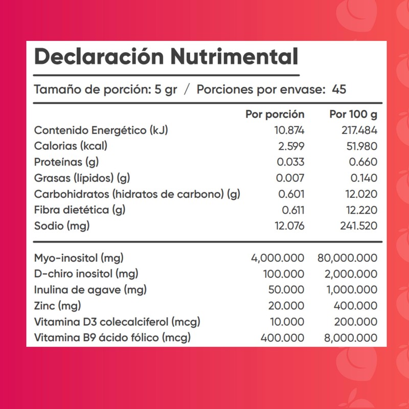 PEACH+ SUPPS Polvo de Inositol Fortificado - Dosis Diaria de 5g - Mezcla Óptima de Myo-Inositol, D-Chiro Inositol, Inulina de Agave y Zinc, 225g - Suplemento de 45 Días