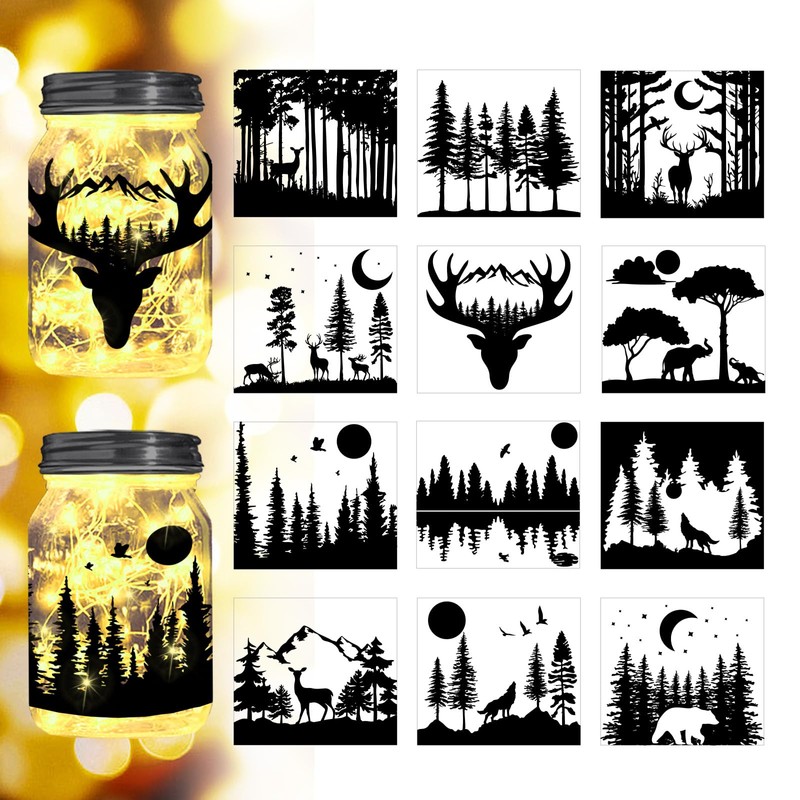 Peacoblue Forest Silhouette Cutouts for Jars, Mason Can, Glass, Wishing Bottle Decor(No Stickers), 12Pcs Reusable Forest Silhouette Lantern DIY Craft Kit Jar Decals Art Mural Home Garden
