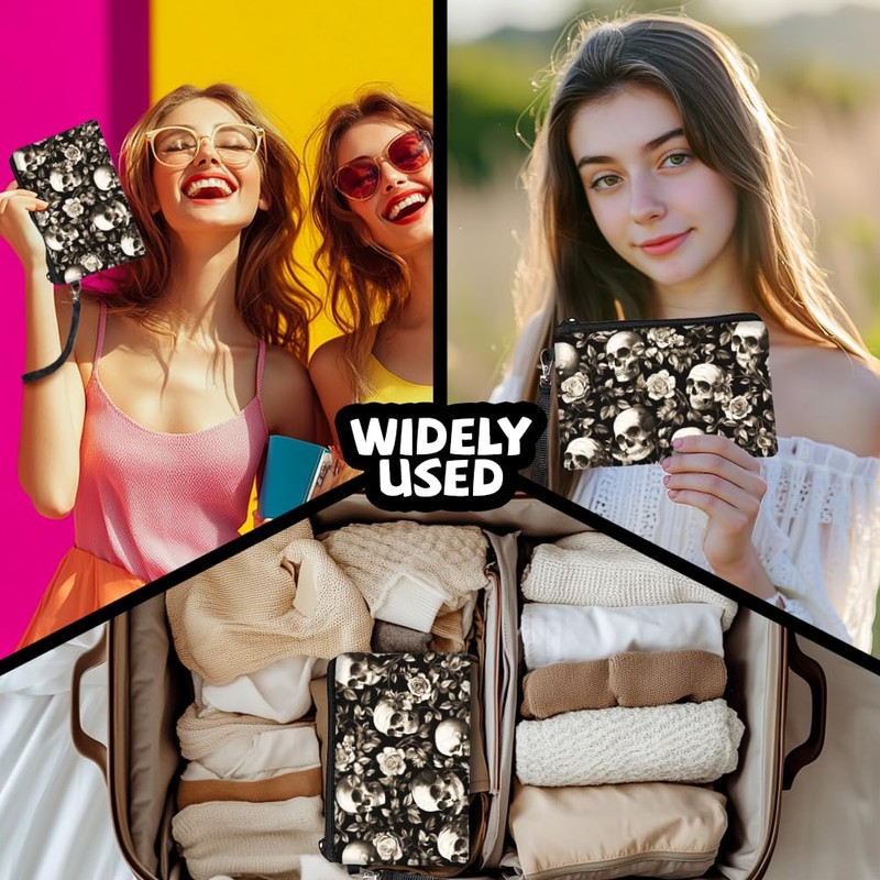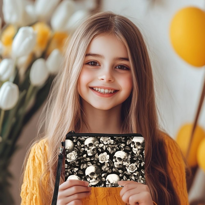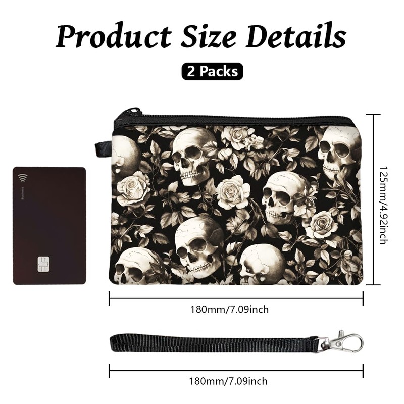 Peacoblue Original Designs Coin Purse for Women Girls Skull and Flower 2 Packs Change Purse with Zipper, Durable and Soft Canvas Wallet Pouch for Travel, Gift