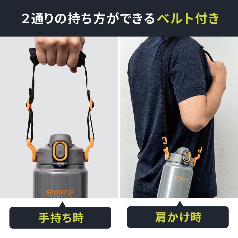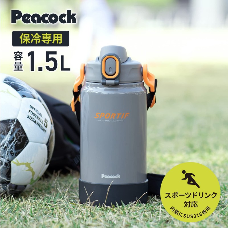 Peacock AJK-R150 H Water Bottle, Large Capacity, 3.5 gal (1.5 L), Vacuum Insulated, One-Touch, Wide Mouth, Direct Drinking, Compatible with Sports Drinks, Shoulder Strap, Washable, Large, Stainless Steel Bottle, Thunder Gray