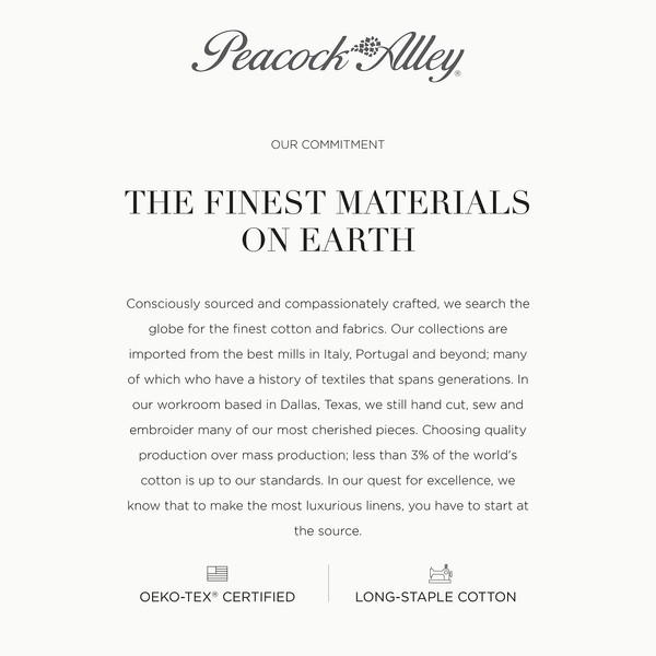 - Peacock Alley: For nearly five decades, Peacock Alley has been synonymous with luxury and high-quality linens. Our commitment to excellence drives us to source the finest fabrics from responsible mills worldwide, with a particular focus on Portugal