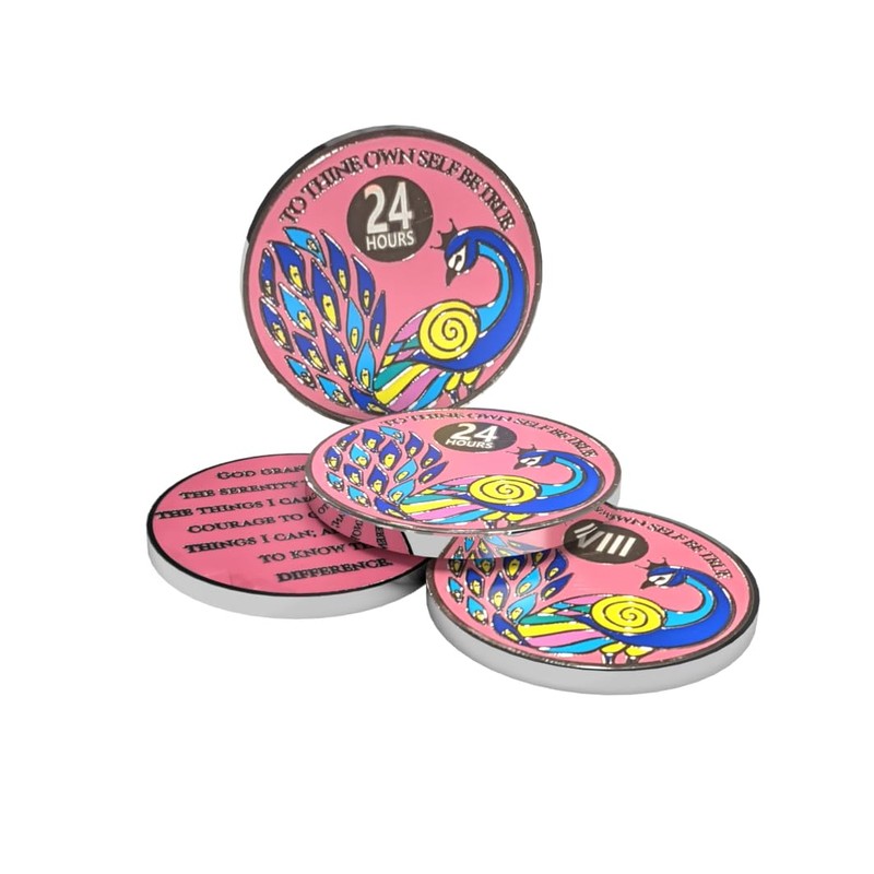 - Graceful and colorful Peacock sober medallion available in 1 to 60 years.