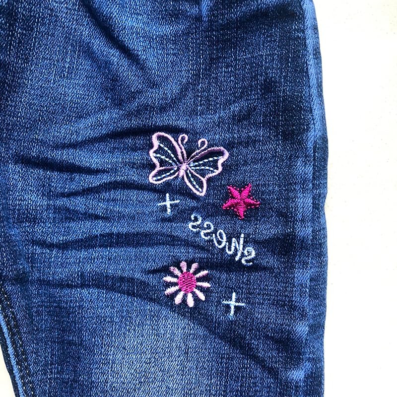 - Pink; long sleeve T-shirt; cute patterns; crew neck; Denim jeans with delicate embroidery, rolled hems and elastic band.