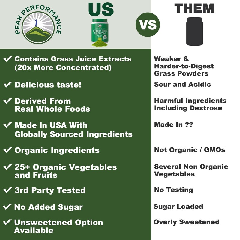 - Don't Be Fooled! All green superfoods are not the same. Peak Performance uses Grass Juice Extract. 20 parts of grass make only one part of grass juice powder - that's why our grass juice powder has 20 times the concentration. Also, unlike cows our stomachs are not made to digest grass. Our grass juice powder is more easily digestible therefore you absorb the maximum nutrients possible in every serving!