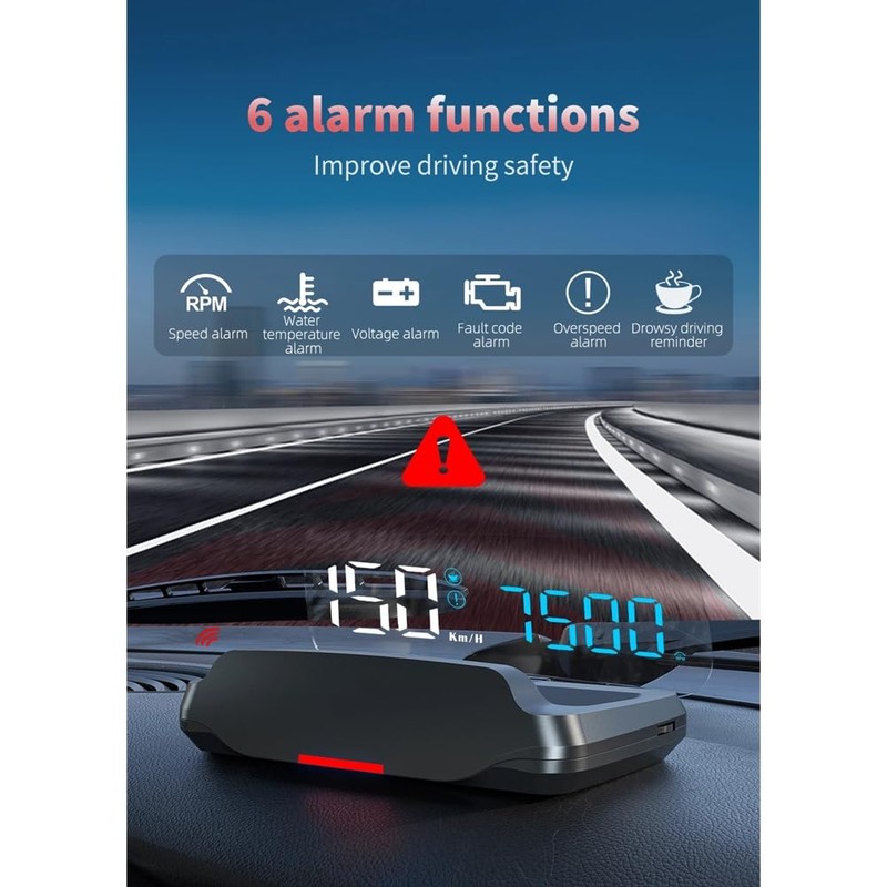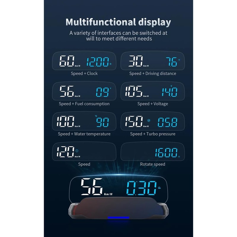 - OBD HUD Function: Vehicle speed, RPM, water temperature, voltage, fuel consumption time, turbo pressure, single driving distance, single driving time, acceleration speed measurement for 100 kilometers