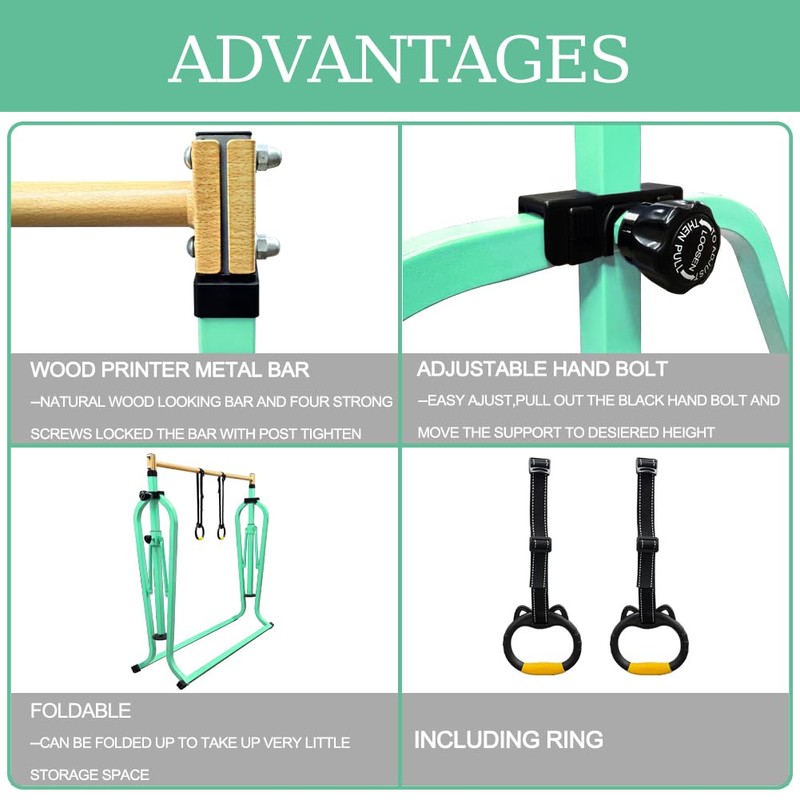 - 【SAFTY AND MORE FUN】Based on the stable gymnastics bar,this item also will come with a mat and ring,it will effectively reduce the impact force,protect the kids and gymnastics ring training can also bring more fun to children.