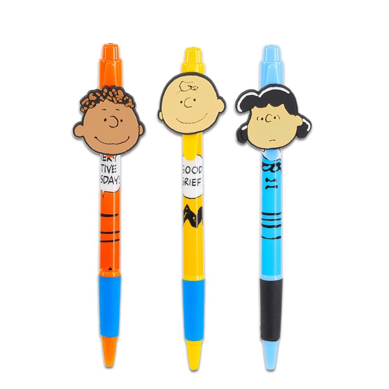 • This Peanuts stationery set includes 3 pens, each with a character clip featuring colorful artwork of favorite Peanuts characters including Charlie Brown, Lucy, and Franklin.