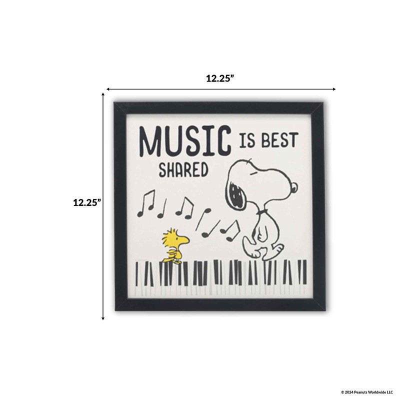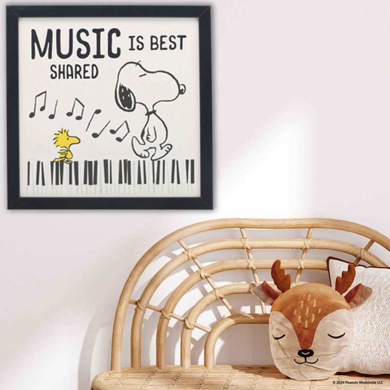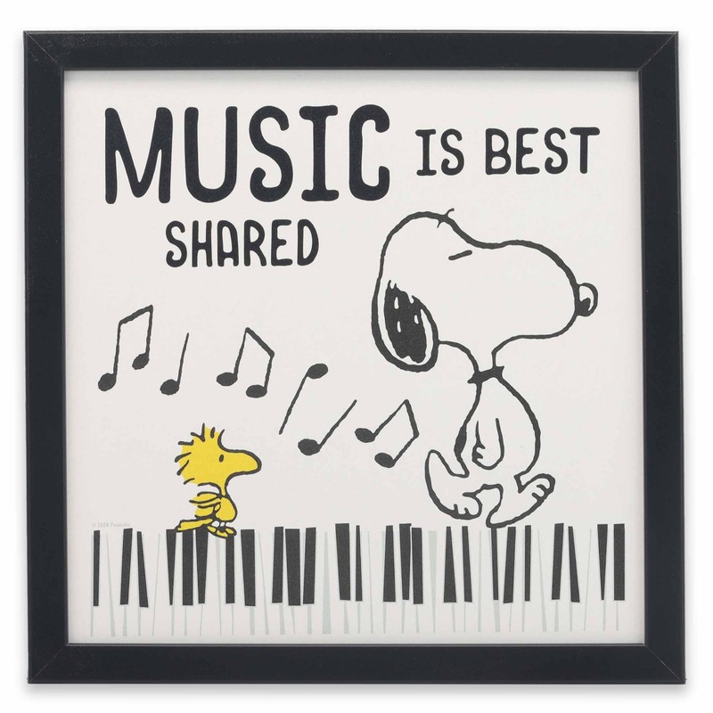- Framed Wall Art: Snoopy and Woodstock stroll along the keys of a grand piano, with music notes dancing around them like a symphony in motion. The scene is rendered in classic black and white, except for Woodstock's vibrant yellow feathers, adding a delightful pop of color. Above them, elegant typography spells out the timeless truth, "Music is best shared." This sentiment embodies the essence of Peanuts, where friendship and camaraderie are celebrated through every joyful note and playful step.
