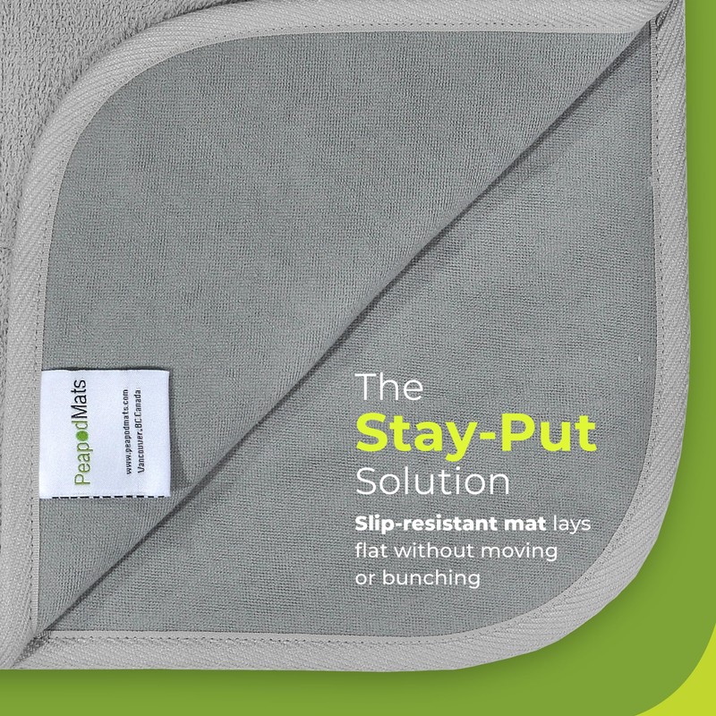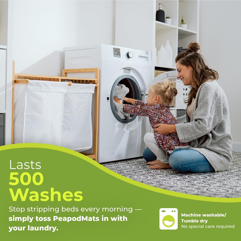 - STAYS IN PLACE WITHOUT FLAPS, STRAPS OR VELCRO = No shifting or moving! No need to tuck or wrap around the mattress! PeapodMats pee pads lay flat on the bed and don’t bunch or move throughout the night!