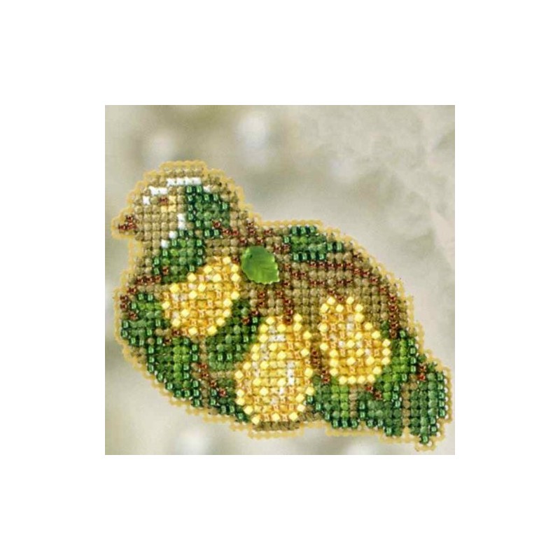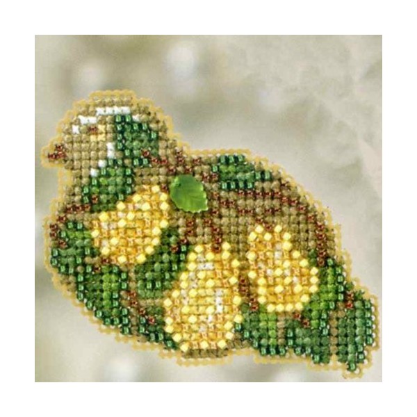 Pear Tree Partridge - Winter Holiday Collection 2012 - Mill Hill Counted Glass Bead Christmas Ornament Kit with Treasure MH182306. A beautiful Pear Tree Partridge for the first day of Christmas! Kit makes one beaded cross stitch Pear Tree Partridge Christmas ornament with Mill Hill Treasure. Finished Size: 2.75 x 2.25 inches.