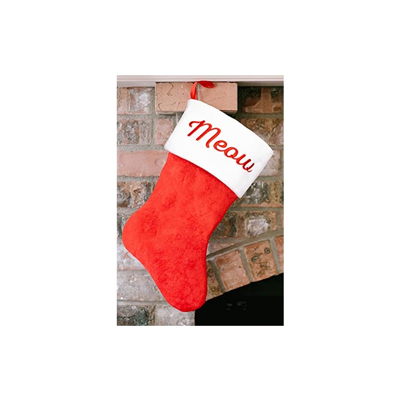 - Charming Design: This delightful stocking features a vibrant red plush fabric, complemented by a cozy white Sherpa cuff. Adorned with whimsical “meow” embroidery in cheerful red, it adds a playful touch to your holiday decor and will surely delight every cat lover.