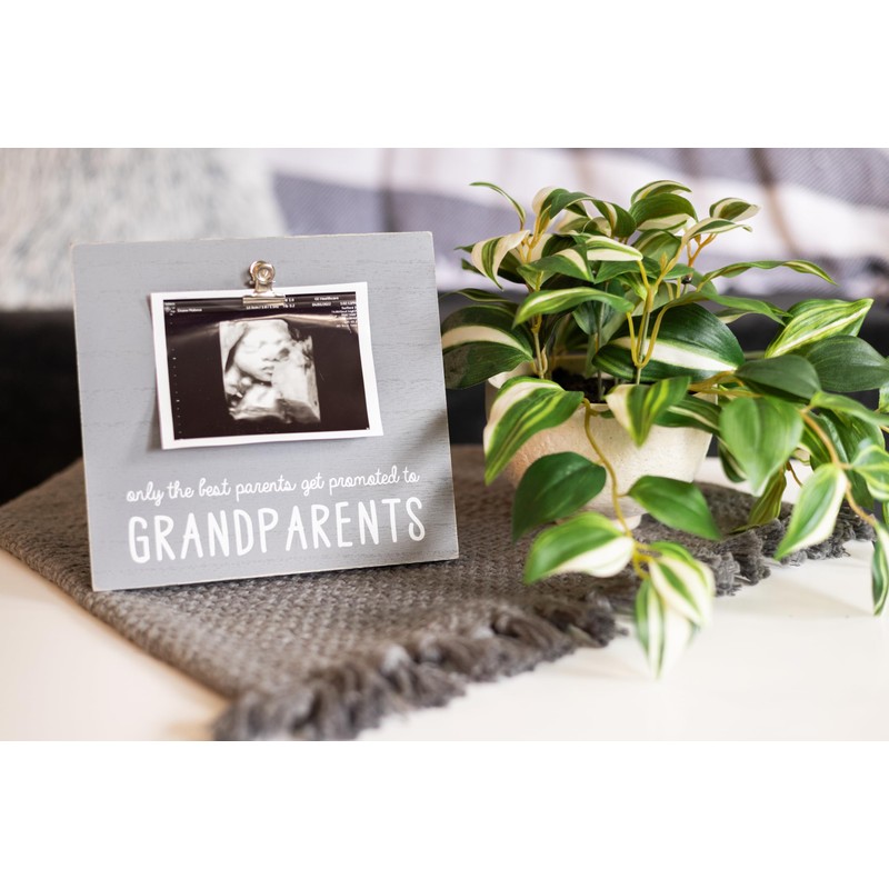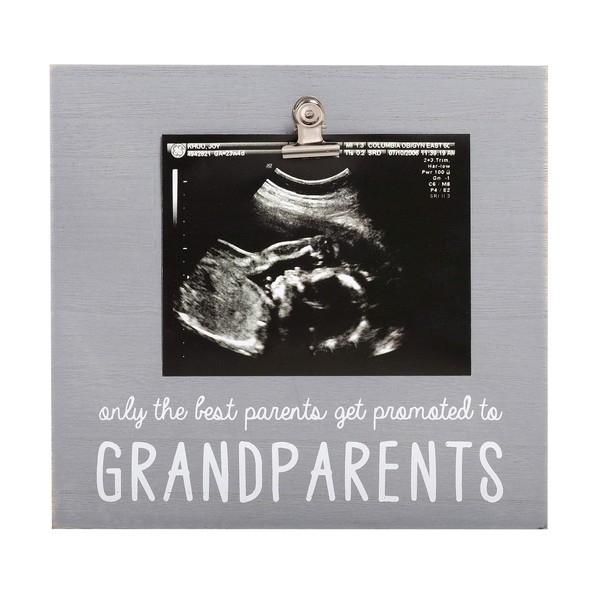 - Includes distressed gray ultrasound photo frame with easel and wall hanger for easy displaying; white print reads “only the best parents get promoted to grandparents”