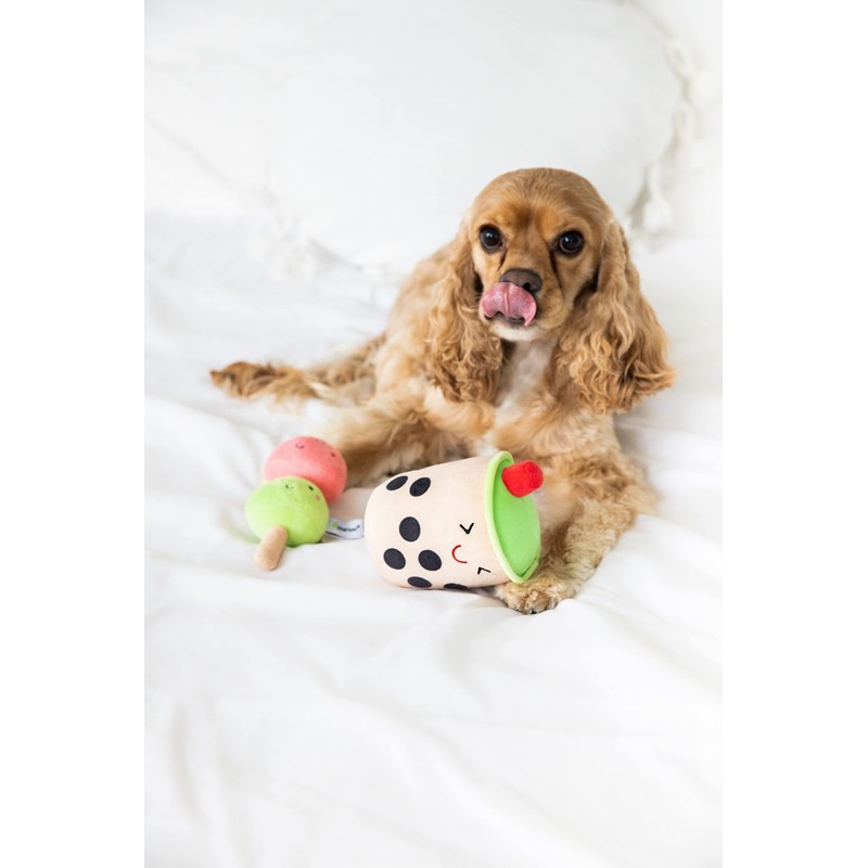 - Enthält zwei quietschende Plüschspielzeuge: einen Boba-Bubble Tee und ein Mochi-Eis