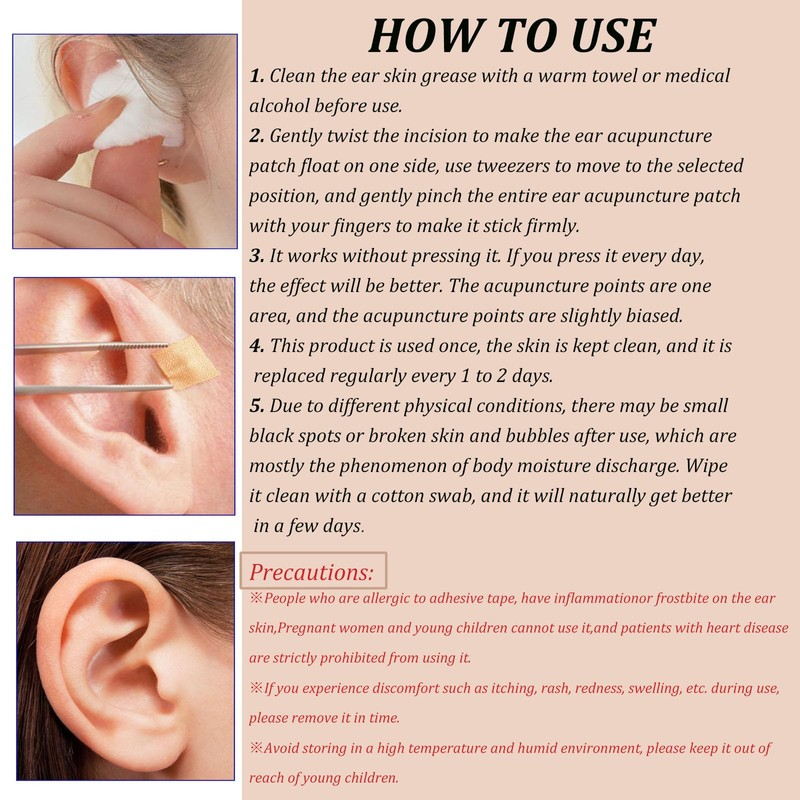 - Easy to Use: Mins with just 3 simple steps. Step 1: Clean your Ear Skin with wipes. Step 2: Pick your Acupressure Point. Step 3: Apply & Press your Ear Seeds. The ear must be FULLY CLEANED, It’s best to apply after a shower and clean your ear very well, wait until the ear is completely dry and oil and debris free.