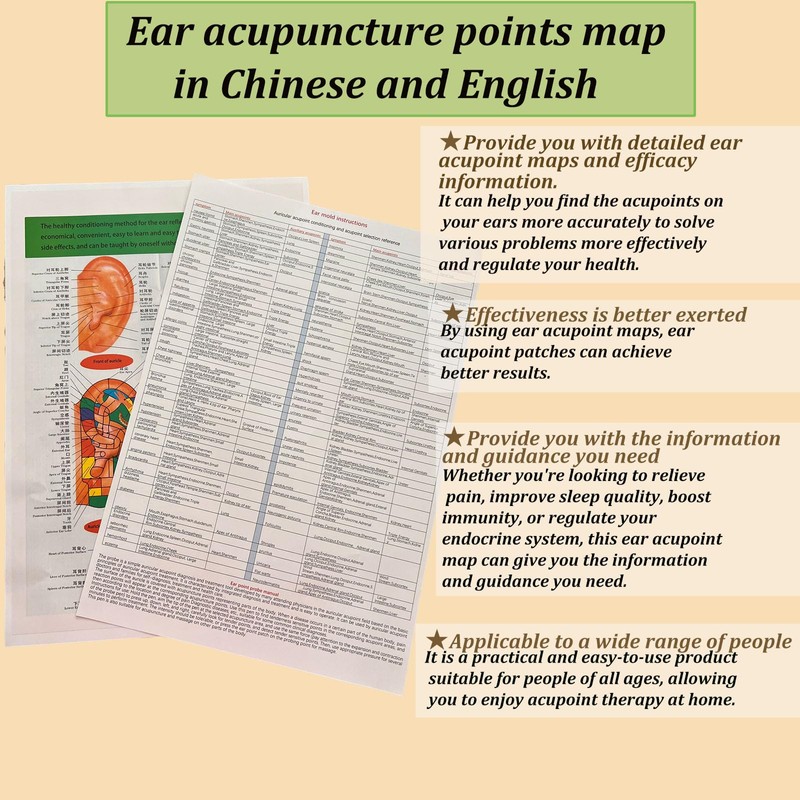 - Package includes of Auriculotherapy: Ear Seeds, 1 pc Acupressure Probe,1pc ear acupoints chart in Chinese and English