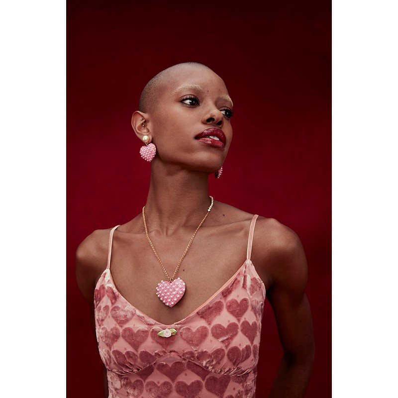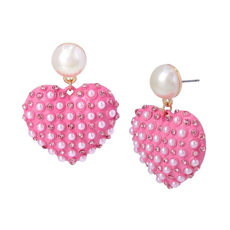 - Lustrous pearl stud featuring dangling pink heart drop adorned with minimal pearls and stone accents. Earrings have a post back closure. Made from polished metal, glass, plastic and faux pearl.