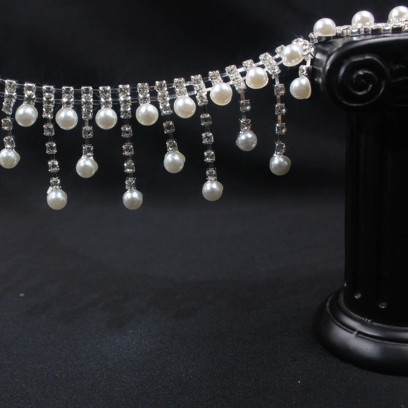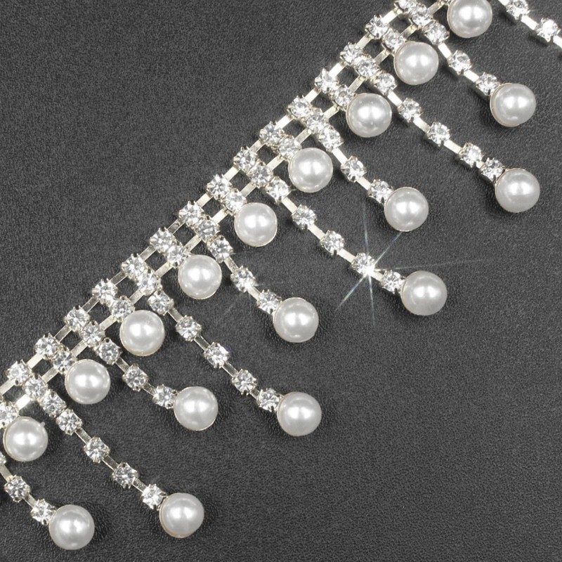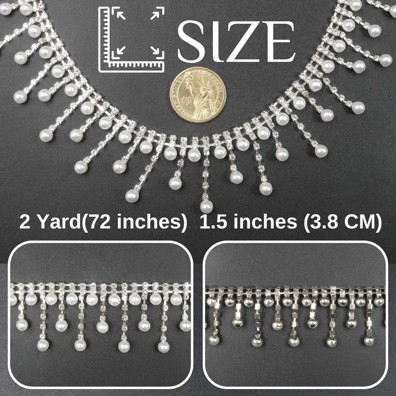 PEARLY JUN 2 Yards Pearl Rhinestone Trim Chain Silver Crystal Fringe Diamond Applique Ribbon String Tassel Strip for Sewing Wedding Dress Crafting Crafts Flower Embellishments