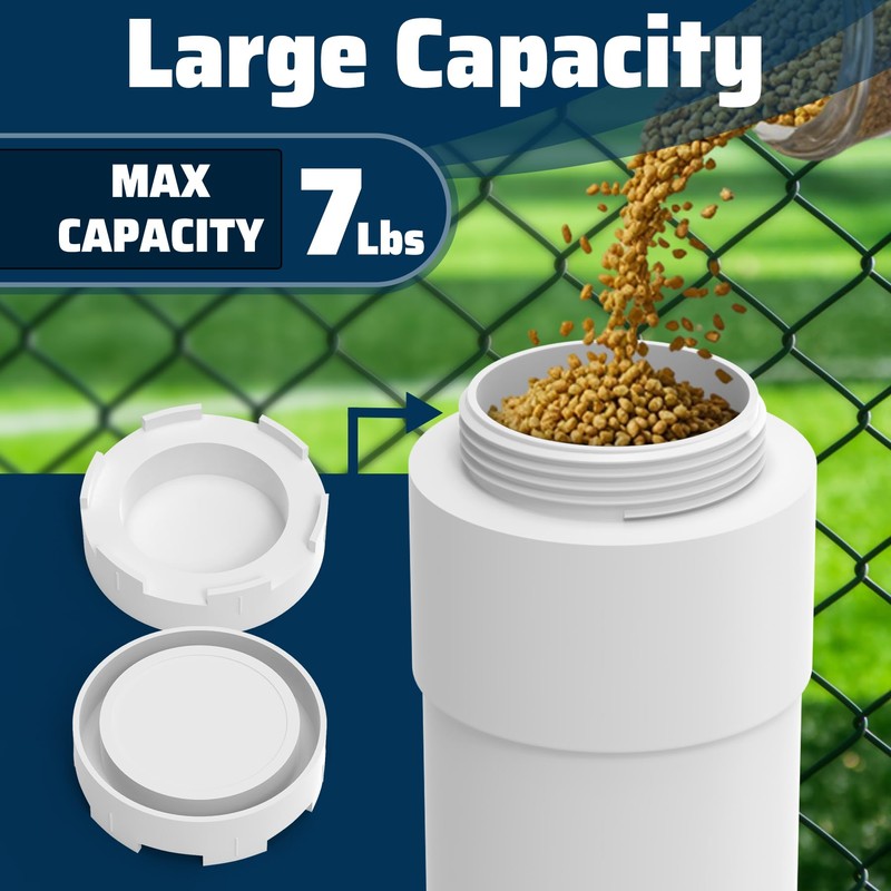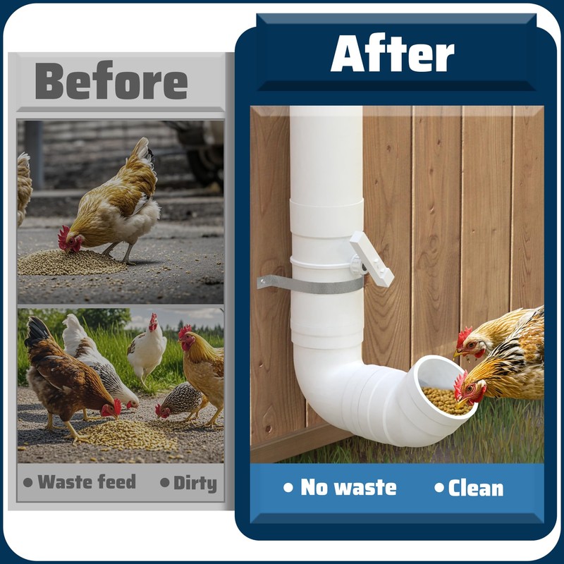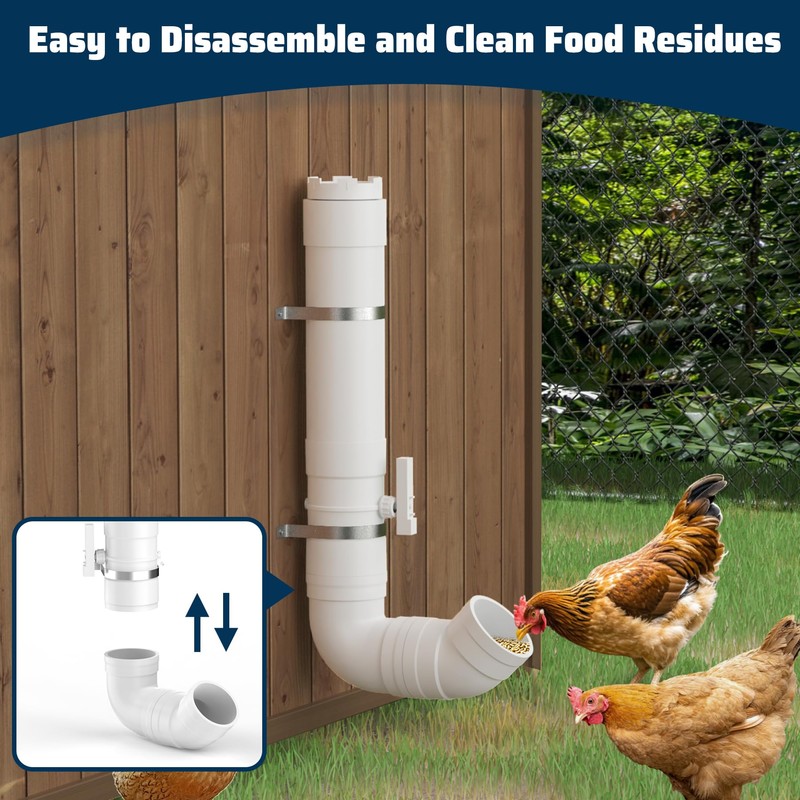 • Chicken Feeder with 2 Lids-Our automatic chicken feeder come with two lids to cover the top and bottom of the chicken feeders.the top lid to prevent rain from entering and the bottom lip prevents mice, squirrels and other small animals from stealing food at night.