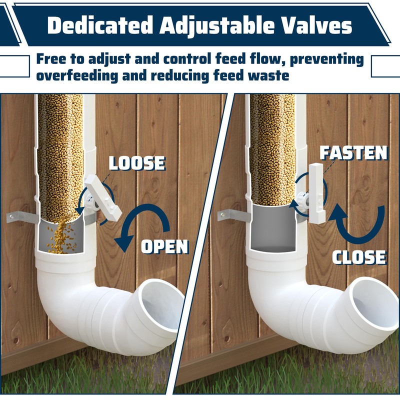 • Feeding Amount Control-The adjustable pipe chicken coop feeder can hold about 7 pounds of feed,our poultry feeder comes with a dedicated adjustable valves, can be adjusted according to the amount of food eaten by different chickens,preventing overfeeding and reducing feed waste.Not only can last longer feeding time,but also saves time and effort in refilling food multiple times a day.