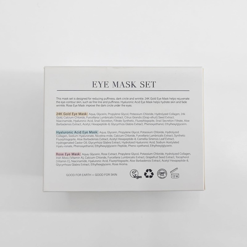 - Independent Packaging: This product contains 10 pairs of rose eye mask, 10 pairs of hyaluronic acid eye mask, and 10 pairs of 24K gold eye mask. 24K Gold Eye Mask helps rejuvenate the eye-contour skin, such as fine line and puffiness. Hyaluronic Acid Eye Mask helps hydrate skin and fade wrinkle. Rose Eye Mask helpsto remove dark circle.Each pair of eye mask is independent packaging to ensure that it will not be contaminated