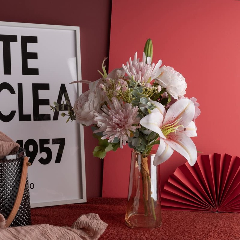 Peauley Artificial Fake Faux Flowers Silk Flower Arrangements Bouquets with Lilies, Buttercup, Hydrangea, Chrysanthemum, babysbreaths (Pink)