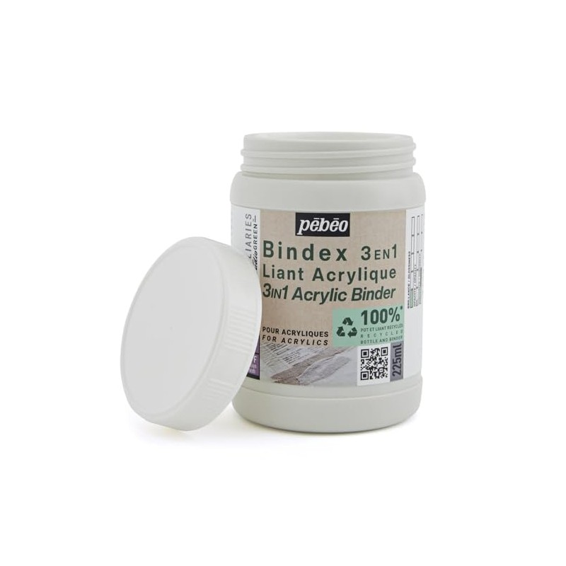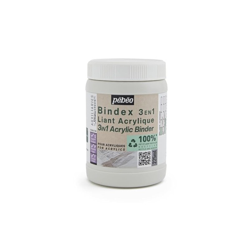 - Pébéo BINDEX 3-in-1-Acrylbindemittel: Inhalt: 475 ml. Acrylbindemittel flüssiger als ein Gel und nicht vergilbend für die Farbvorbereitung. Geeignet als Unterlage, Farbe oder Finish; lichtdurchlässig und dokumentenecht; schnelltrocknend; Verdünnung mit Wasser; Finish: durchscheinend und satiniert-matt. Gut zu wissen: Dieses Produkt ist perfekt für Ihre gemischten Media-Projekte geeignet.