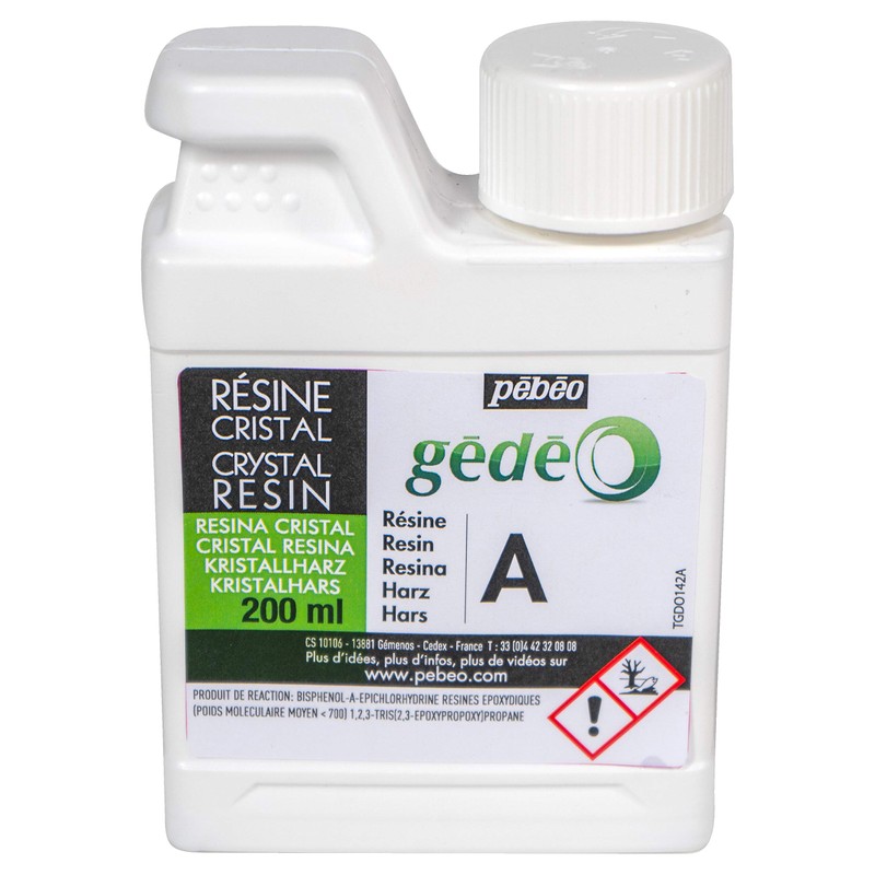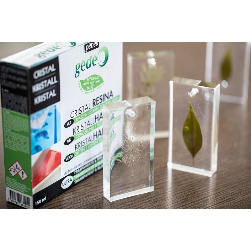 The crystal clear choice for arts and crafts The Gedeo Clear Liquid Resin Bio is a high-gloss, very transparent resin. The unique liquid texture is ideal for use on a wide variety of mediums such as wood, silicone, plastic, canvas, and more. Both artists and DIY crafters alike will appreciate the easy to pour formula that makes filling in moulds or small bordered surfaces a breeze. Get creative and use our Gedeo Clear Liquid Resin Bio to create inclusions using natural elements such as flowers, leaves, or anything else that inspires you A liquid fix for furniture Seal the deal with Gedeo Clear Liquid Resin Bio Our versatile liquid resins can also be used as a protective, high gloss coating for table tops, bar countertops, and other pieces of furniture. Our Gedeo Clear Liquid Resin Bio is a low-odor, two-part epoxy resin system (resin and hardener) that allows for remarkable ease-of-use and a beautifully bubble- free, non-yellowing finish. An formula that you’ll feel good about Our Gedeo Clear Liquid Resin Bio is a revolutionary new product that is created from earthy-friendly, bio-based materials, with over 50% carbon that are derived from plants. Ours is one of the latest innovations in bio-based chemistry, allowing for professional results and simplicity of use. At Pebeo, we’re breaking the mould For three generations, Pébéo has combined its technical expertise with its love of art with a desire to create the best art supplies for artists around the world. Pébéo offers top quality, professional grade materials along with the most technically superior formulations. All NEW Gedeo Bio-Based Resins are incomparably transparent, glossy and solid, while being more respectful of the environment. Available in 45 ml, 150 ml, 300 ml and 750 ml kits.