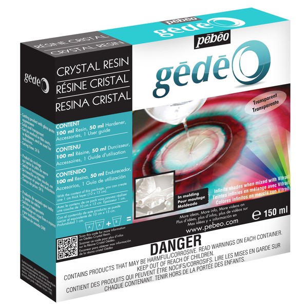 The ultimate Mixed Media material Very solid, Pébéo Crystal resin imitates glass paste thanks to its two-component epoxy resin system (resin curing agent). This transparent epoxy resin wood, metal, earthenware, canvas, plastic etc. will be suitable for jewelry, objects, frames, friezes, friezes, bars. . . Pébéo, your creative partner Fortified by a know-how built almost 100 years ago for artisans around the world, Pébéo offers the general public creative and craft activities. Ideal in Mixed Media, this resin is compatible with all media. Its liquid texture is suitable for casting in edged media (2 cm thick, small parts), molding (5 cm thick), inclusions (2 cm thick) and even as a protective varnish; The Crystal epoxy resin takes the surface appearance of the substrate in which it is cast. A matt mold will give a matt finish, a glossy mold a glossy finish; Odorless, this liquid resin for Moulding and casting has a setting time of 24 hours. Thanks to the simple dosage of its two-component epoxy system (resin and curing agent), this resin inclusion, Moulding casting offers a professional result. This product is intended for an initiated and professional audience. Test the glass paste effect You will receive the Gedo Kit Cristal 150 ML, the smallest format proposed for this product, perfect for a first experience. Use your resin in a thousand and one ways, when casting on a tray bottom. . . Available in 150 Ml, 300 ml and 750 ml kits. Conforms to ASTM D-4236.