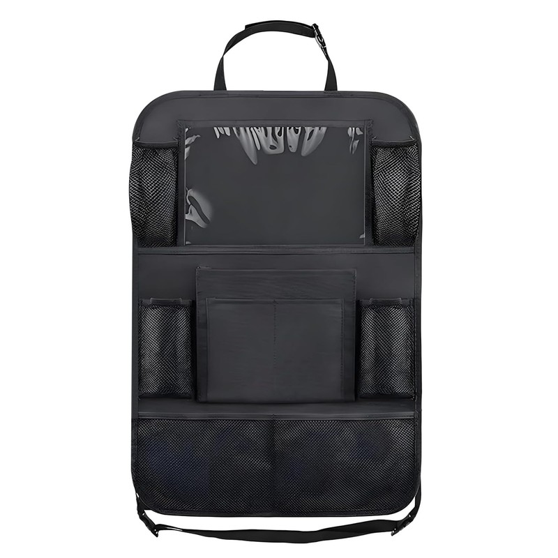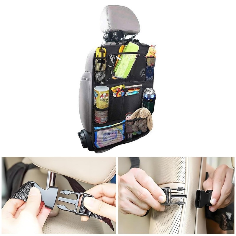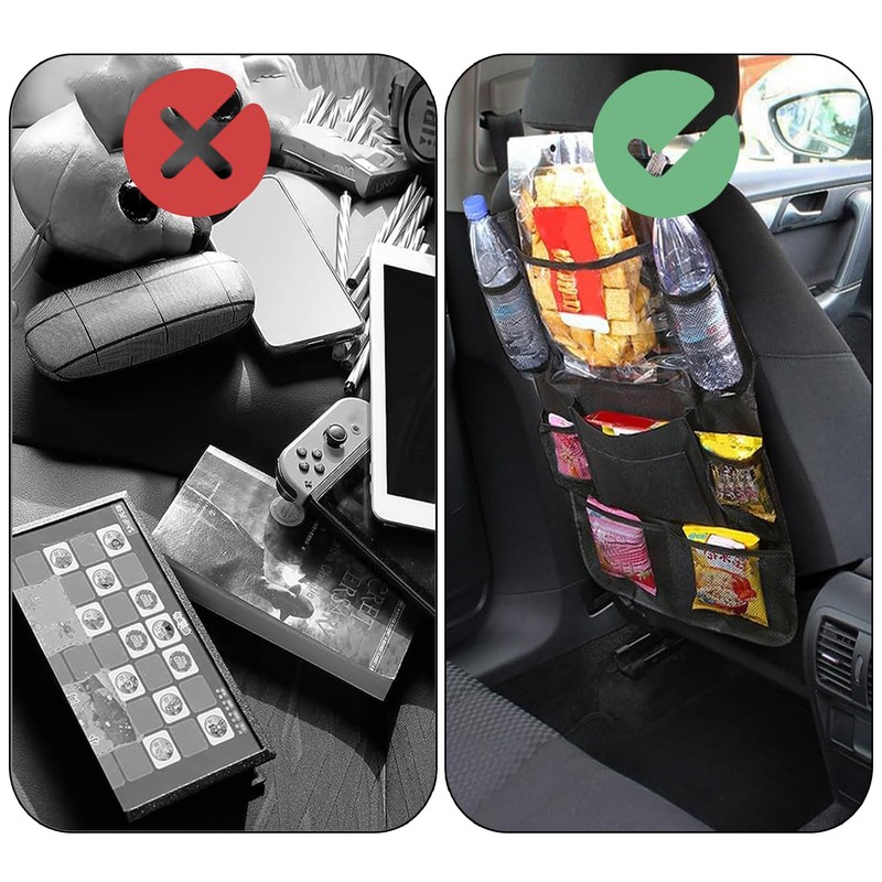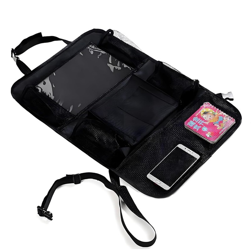 - This car seat organiser features a large capacity design. Convenient storage for books, magazines, beverages, bottles, tablets, children's toys, and more, for families with kids and cars.