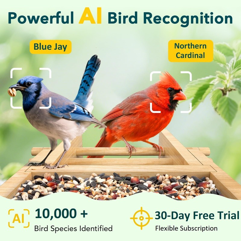 - 【User and Nature-friendly Wood & Easy Setup】Made from biodegradable wood, this camera bird feeder blends naturally into your garden while being eco-conscious. Setup is a breeze—just connect via 2.4G WiFi (not fit 5G) and enjoy! It can be mounted anywhere in your backyard (strap/drill/polemounting). The transparent seed tray makes refilling simple, perfect for hassle-free bird feeder with camera use