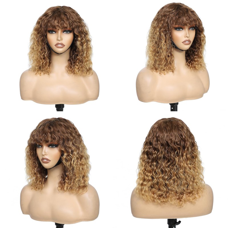 PECWU Peluca Rizada Con Flequillo, Cabello Humano, 14'', Afro Rizado, Sin Encaje Frontal, Sin Pegamento, Para Usar Y Llevar, Corta, Rizada, Estilo Bob, Para Mujeres Negras, Resaltada, T4/27, Ombré, Ru