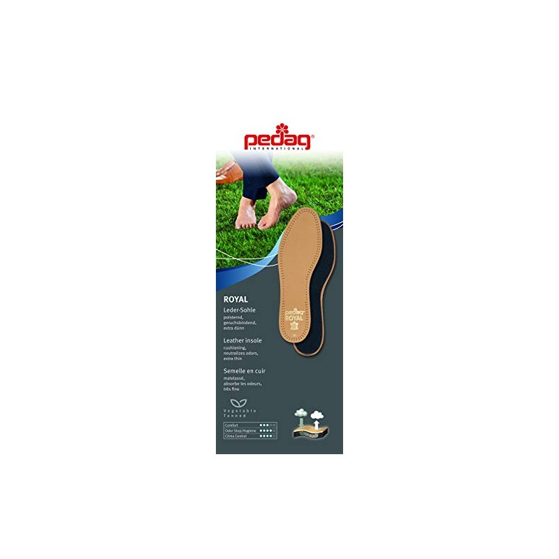ROYAL: Genuine, vegetable tanned sheepskin, natural, active carbon filter prevents odor, slightly padded with latex foam. Royal is the perfect, breathable liner for your shoes. Highly absorbent: Neutralizes perspiration. Royal is durable because it is made of leather. 1/2 sizes buy next higher whole size. The Pedag Brand: Pedag is a Euro Comfort brand of footcare. Pedag merges 3 elements: Nature, Science and Technology to produce products that are good for the modern foot. Nature is found in Pedag�s use of high quality natural materials such as vegetable tanned leather, pure cotton, wool, sisal, water based adhesives and active carbon and silver ions for odor control. Science is found in Pedag�s use of supportive, anatomically correct footbeds and inserts that support the arches, muscles and ligaments of the foot. Supporting the foot adequately provides a base from which to support the ankles, hips and spine. Pedag orthotics stress Support rather than simple Cushioning. You will find Pedag orthotics that address: Heel pain, fallen arches, spreading feet, plantar fasciitis, heel spurs, Pronation and Supination, different leg lengths, Achilles Tendonitis and many other foot problems. Pedag is different. Even our flat, non-orthotic insoles are different because they too combine Nature, Science and Technology. Pedag insoles (orthotic or plain) allow the foot to breathe inside the shoe, keeping feet and shoes fresh. Did you know the foot produces a shot glass of perspiration daily. Insoles that absorb moisture, breathe and prevent odor are necessary for healthy feet. Technology is found in Pedag�s modern manufacturing facilities in Germany (even though much of the production of our insoles is still done by hand), stringent quality controls and introduction of cutting edge technologies such as nano ions of silver for permanent odor prevention in several of our insoles and an innovative new material to insulate against cold.