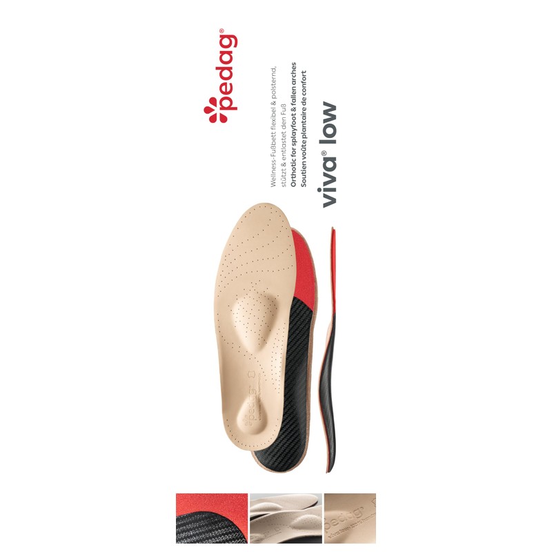 • Give your fallen arches a break and cushion your feet with pedag VIVA Low! Extra low longitudinal arches need extra support for proper foot orientation. Compensation causes heel and ball of foot pain, which causes you to walk unnaturally. A proper insole helps you to balance correctly, and the effects can travel all the way from your toes to up your spine. Metatarsal arch pad helps take the pressure off bunions, and the heel cushion provides extra comfort and shock absorption.
