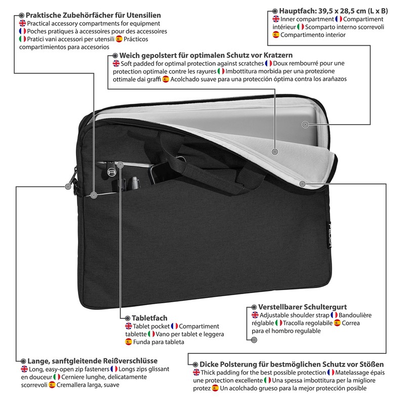 - Equipped with thick padding and a fleece-like inner lining, the laptop bag offers the best possible protection against scratches and bumps; long, smooth-sliding zips for convenient access to your laptop or accessories