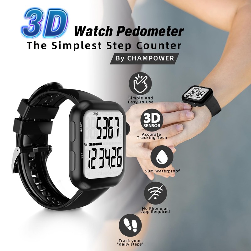 - Accurate Step Counting: CHAMPOWER watch pedometer uses advanced 3D Tri-Axis sensor technology. Whether it is worn on the hand, clipped on the clothes or in the pocket, it provides accurate X, Y, Z vector step detection.