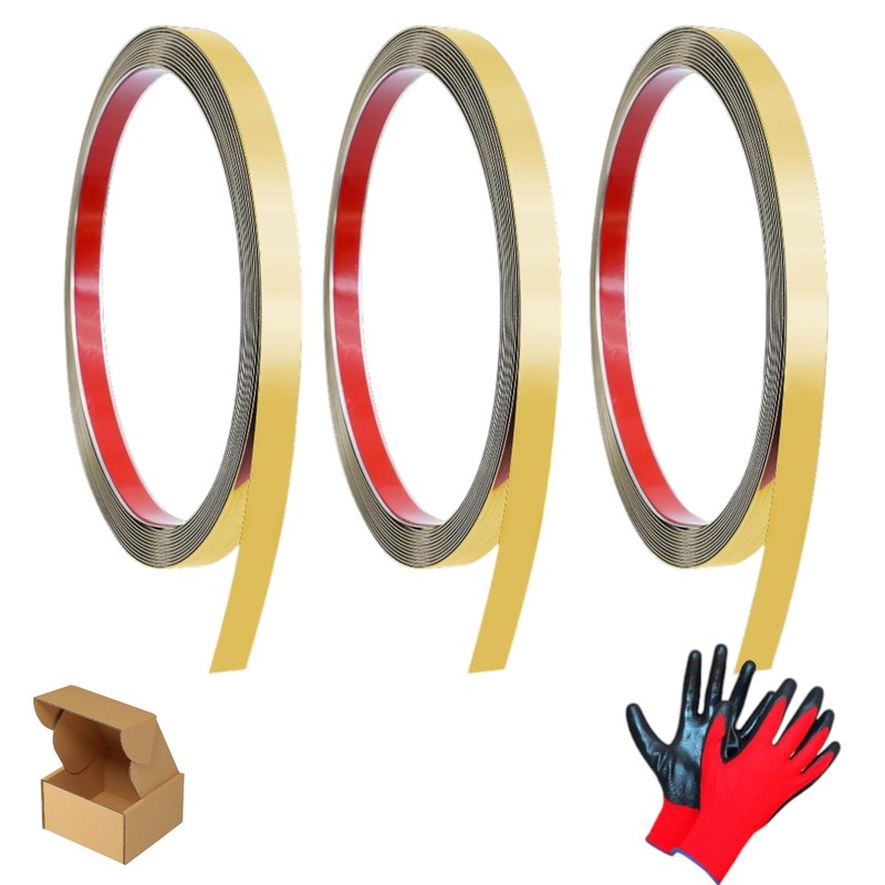 Peel Stick Mirror Trim, Self-Adhesive Metal Molding for Walls, Frames, and Kitchen Backsplash, Flexible Decorative Border, Set of 3 (16.4 ft x 0.4 in) Gold