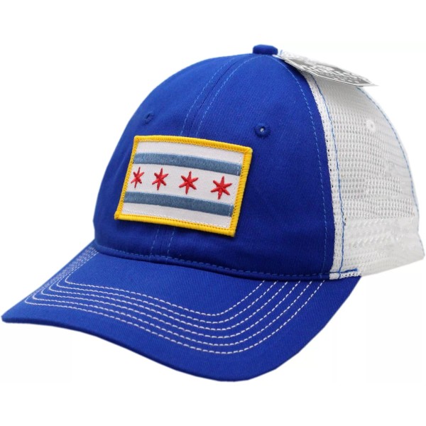 Peerless Embroidery Chicago Flag Hat Trucker Mesh Adjustable Gold Border Royal/White