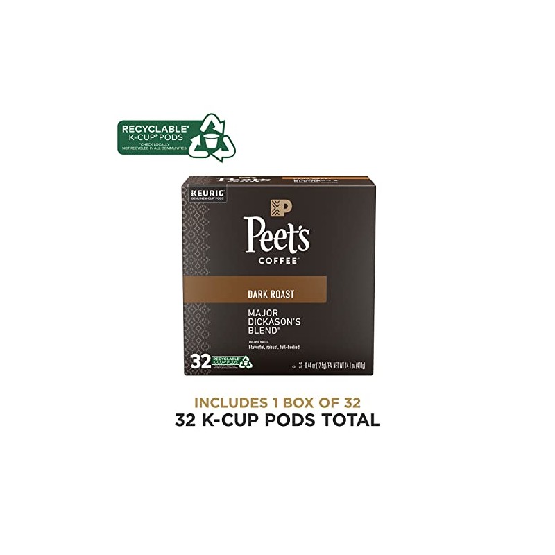 - Contains one (1) Box of 32 Peet's Major Dickason's Blend Dark Roast Coffee Keurig K-Cup Pods - 100% Arabica Coffee. Packaging may vary for a limited time.