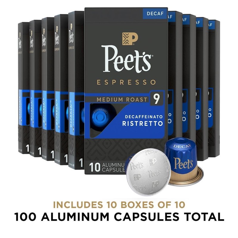 - Contains ten (10) Boxes of 10 Peet's Decaffeinato Ristretto - Intensity 9 Medium Roast Decaffeinated Coffee Single Cup Espresso Capsules (100 Espresso Capsules Total)