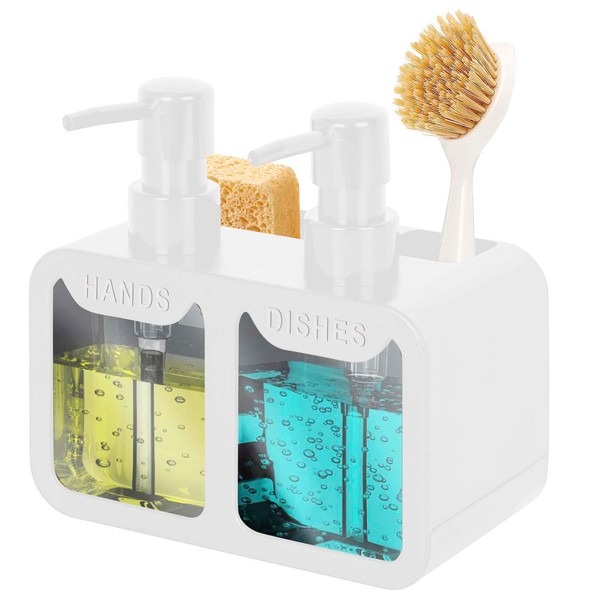 Peevel Dish Soap and Hand Soap Dispenser for Kitchen Sink, Soap Dispenser Set with Sponge Caddy and Brush Holder, Organizer for Kitchen Sink Countertop, White