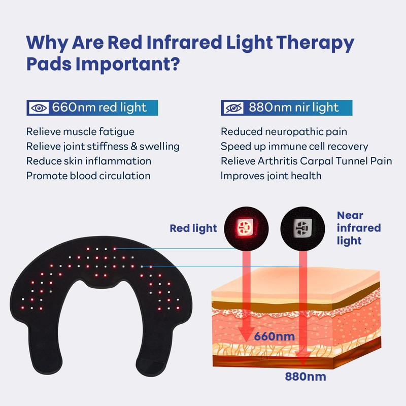 - Advanced Dual-Wavelength Technology:Equipped with 28 LEDs emitting 660nm red light and 28 LEDs emitting 880nm near-infrared light, the pad delivers high-intensity illumination. This carefully calibrated combination of wavelengths enhances the therapeutic benefits of red light therapy for shoulder pain, effectively targeting shoulder pain, accelerating muscle recovery, and alleviating conditions like arthritis.