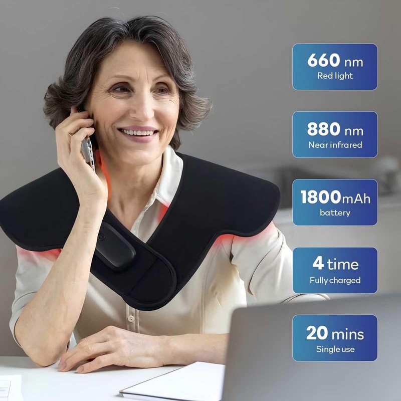 - Convenient and User-Friendly Features:For added ease of use, the pad includes an automatic shut-off function for safety and features a wireless design. This eliminates the hassle of cords and manual timers, allowing you to experience the benefits of red light therapy for neck and shoulders anytime, whether at home or on the go.