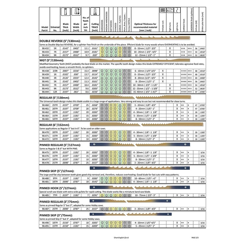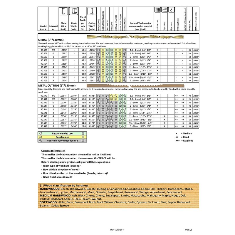 - The Charts shown are a BASE for people who wants to begin scrolling and don't know which blade to select for their project, based on the wood type to cut [1], the thickness of it [2], the pattern [3], the expected finish [4] or the hole size to drill for inside cuts [5].