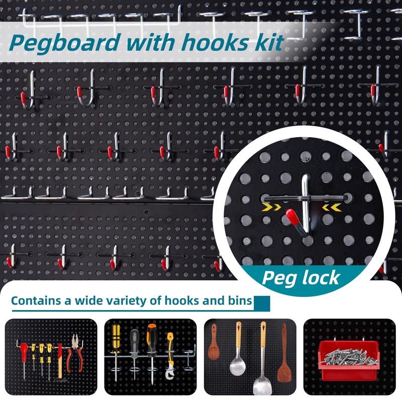 - Varied Pegboard Accessories: The product also includes 180 pieces of various hooks and accessories,pegboard bins,curved hooks, angled hooks, straight hooks, and ring tool holder, multi tool rack.