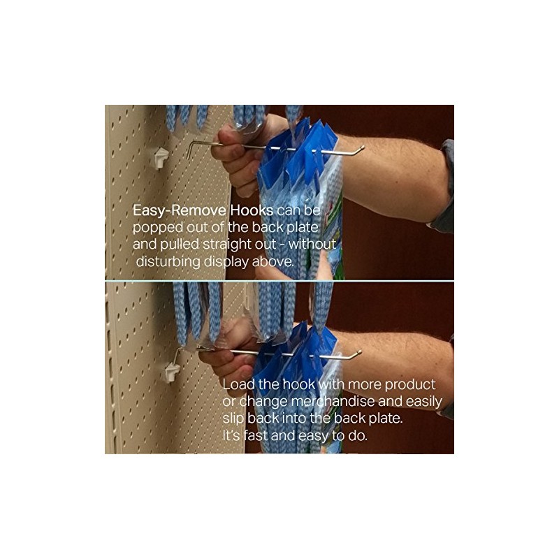 - The metal hook easily slides in and out of the plastic back plate to save time when changing out products. This design allows you remove & replace the hook while leaving the other hooks in place.